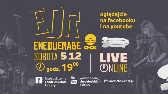 Na nadchodzącą sobotę, 5 grudnia zaplanowany jest koncert zespołu ENEDUERABE, który rozpocznie się o godzinie 19.00. To oczywiście nie koniec atrakcji. Chodzieski Dom Kultury zaprasza w każdym tygodniu na kolejne wydarzenia, wśród których są przewidziane zarówno występy muzyczne, jak i teatralne.ChDK stawia przede wszystkim na lokalnych twórców, związanych z Chodzieżą i najbliższą okolicą. Internetowy odbiór imprez na żywo zyskuje na popularności, czego dowodem są wzrastające statystki odbioru tych wydarzeń przez internautów.Występy w ramach streamingu ChDK mają jeszcze jedną ważną zaletę. Są zarejestrowane cyfrowo. Ponadto, część z koncertów powiązana jest z nowymi wydawnictwami płytowymi lokalnych twórców, których mecenasem od wielu lat również jest Chodzieski Dom Kultury.Szczegółowe i aktualne informacje dotyczące imprez organizowanych przez ChDK można uzyskać na facebookowym profilu Chodzieskiego Domu Kultury oraz na stronie chdk.com.pl