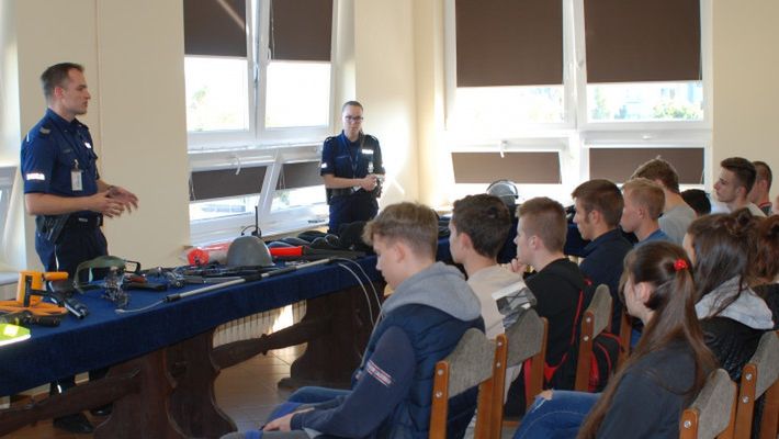 W trakcie spotkania uczniowie dowiedzieli się jak wygląda praca policjantów w zakresie zapewnienia szeroko rozumianego bezpieczeństwa i porządku publicznego. Gdy omawiane były zagadnienia związane z przeciwdziałaniem przestępczości kryminalnej, licealiści mieli okazję z bliska zobaczyć między innymi środki przymusu bezpośredniego, broń palną oraz środki ochrony osobistej. Policjanci zwrócili szczególną uwagę na kwestie związane z profilaktyką społeczną, która stanowi istotny element w kształtowaniu poczucia bezpieczeństwa wśród mieszkańców oraz wpływa na poprawę współpracy pomiędzy Policją, a społeczeństwem. W tym miejscu policjanci omówili służbę dzielnicowych, jako policjantów tzw. „pierwszego kontaktu”. Ale codzienna służba to nie tylko zatrzymywanie sprawców przestępstw i wykroczeń i praca profilaktyczna. To także niesienie pomocy osobom poszkodowanym w różnego rodzaju wypadkach i zdarzeniach. To właśnie policjanci bardzo często są pierwsi na miejscu zdarzenia i wyposażeni w odpowiednią wiedzę oraz sprzęt mogą skutecznie ratować życie i zdrowie osób poszkodowanych. Podczas spotkania uczniowie mieli możliwość także obejrzeć sprzęt służący do zabezpieczenia i oznakowania miejsca zdarzenia.
