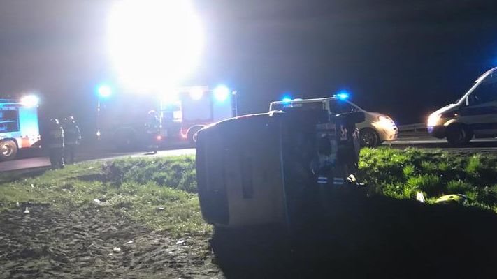 Na poboczu drogi z uszkodzonym przodem stał samochód marki Peugeot, w którym pozostawały dwie osoby. Drugi pojazd VW T5 leży na boku poza drogą z uszkodzonym przodem, wszystkie podróżujące nim osoby znajdują się poza pojazdem.