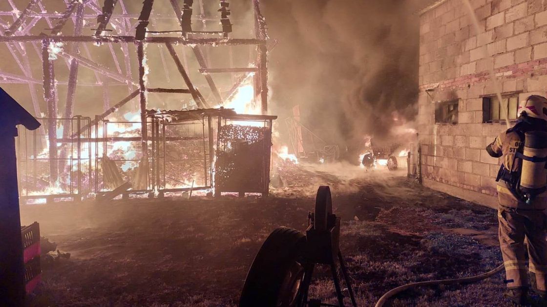 Po przybyciu na miejsce zdarzenia stwierdzono, że pali się stodoła, która jest objęta w całości pożarem, zagrożona jest chlewnia oraz budynek mieszkalny – brak osób poszkodowanych.